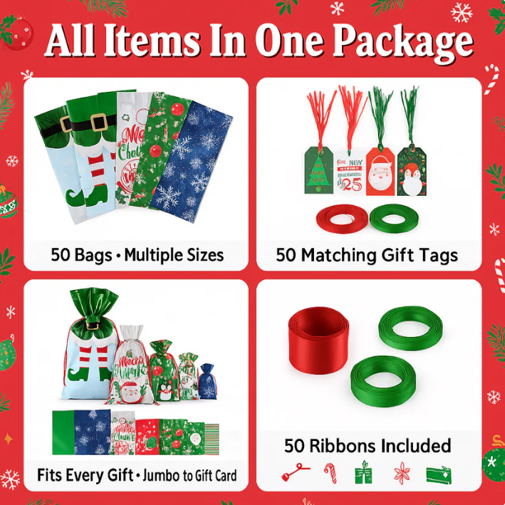 The set includes a wide range of options to fit every gift type: 2 jumbo bags, 3 extra-large bags, 3 tall large bags, 5 large bags, 4 medium bags, 4 wine bags, 4 gift card holders, and 25 gift tags. Each size is tailored to specific gifts—from wine bottles and gift cards to jumbo surprises—meeting all your holiday giving needs.