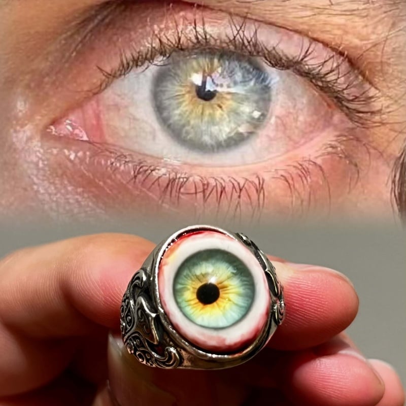 👁️🗨️ The DARK LORE is a captivating handcrafted piece, featuring a lifelike eyeball design with a rich brown iris, a deep black pupil, and intricate blood vessel detailing. The eyeball is crafted from eco-friendly resin and soft polymer clay, ensuring durability, waterproofing, and fade-proof properties. The ring band is made from 925 sterling silver, adorned with delicate engravings, and designed with an adjustable open band for a perfect fit.