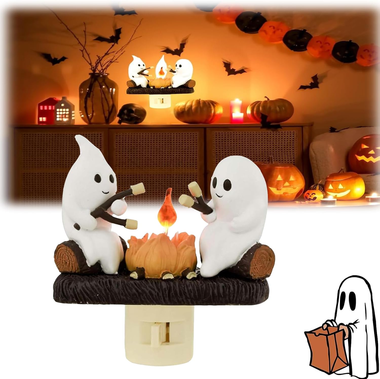Flickering flame nightlight features 2 ghosts roasting s'mores at , bringing a charming and playful vibe to your home decor. Mimics the gentle flicker of a real campfire, creating a calming and cozy atmosphere.