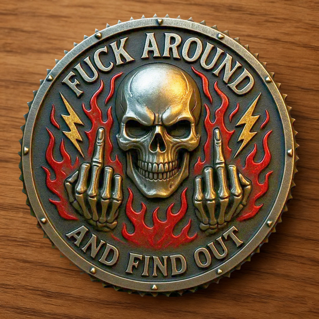 Front: A skull engulfed in flames, lightning bolts, and a defiant gesture, encircled by the words "F AROUND AND FIND OUT"*