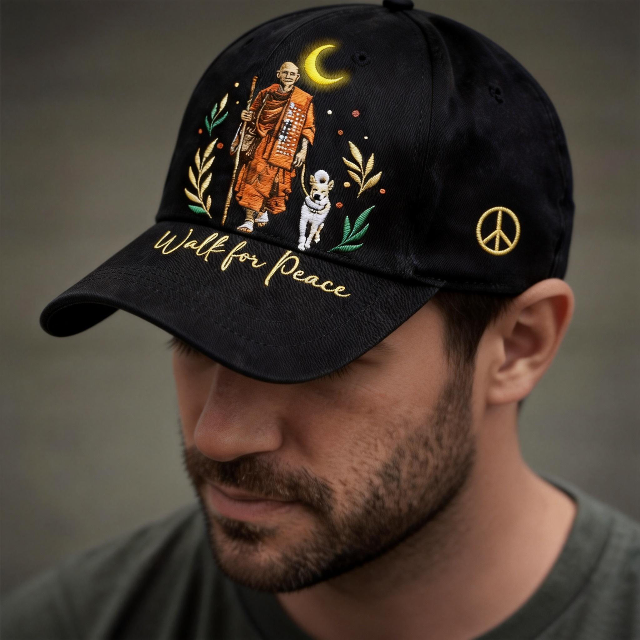 A premium embroidered cap inspired by mindfulness, companionship, and the quiet strength of moving forward — one step at a time.
